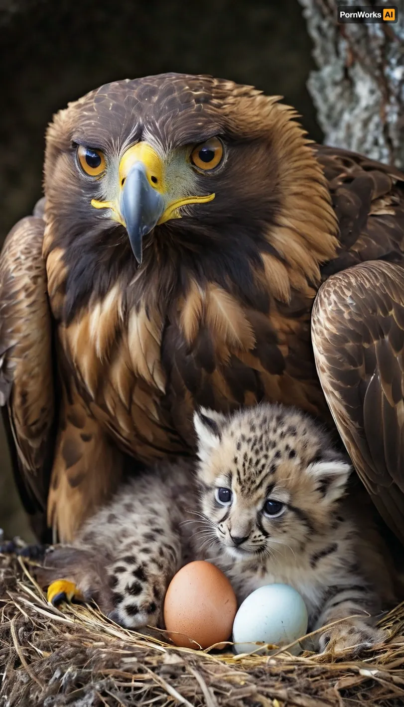 A RAW photo, A golden eagle with eggs and a snow leopard cub, nestled together in a nest high in the mountains., <lora:WildcardX-XL-Detail-Enhancer:.8> A RAW photo, A golden eagle with eggs and a snow leopard cub, nestled together in a nest high in the mountains., <lora:WildcardX-XL-Detail-Enhancer:.8>