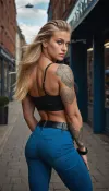 athletic 18 yo girl in shopping mall, cum on face, muscular body, big blue eyes, long blonde hair, Slicked-back hair, expressive makeup, beautiful rectangular face, expressive cheekbones, tanned skin, big round breast, big coloured tattoos on chest, topless, jacket, high hill boots, small handbag, photorealistic, detailed face, blue eyes, posing, L1NAL1S, uberfit, muscular, athletic, <lora:L1NAL1S_last:1.8>, <lora:uberfit_lora_sdxl:2>