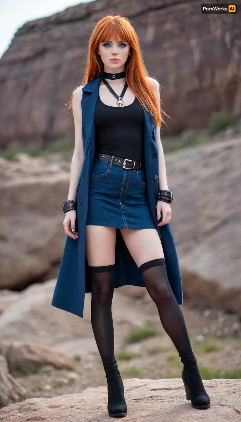 1 Girl, (29 Years old, FULL BODY, Clonated face), (Flat chest, Skinny figure), (Big blue eyes, Glowing eyes), (Very long hair, Bangs, Straight hair, Orange hair), (On a rock metal style stage), (Black trench coat vest, fitted blue halter neckline top, black denim mini skirt, dark blue see-through thigh-high stockings, open-toe rock/metal combat boots), (EXTREM LONG SHOT, FULL BODY, FROM HEAD TO TOE, PANORAMIC SHOT OF HER) 1 Girl, (29 Years old, FULL BODY, Clonated face), (Flat chest, Skinny figure), (Big blue eyes, Glowing eyes), (Very long hair, Bangs, Straight hair, Orange hair), (On a rock metal style stage), (Black trench coat vest, fitted blue halter neckline top, black denim mini skirt, dark blue see-through thigh-high stockings, open-toe rock/metal combat boots), (EXTREM LONG SHOT, FULL BODY, FROM HEAD TO TOE, PANORAMIC SHOT OF HER)