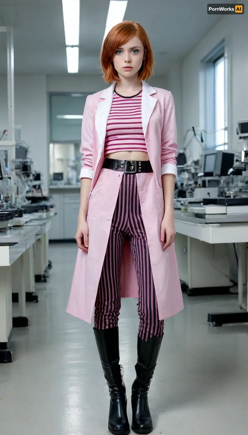 1 Girl, (19 Years old, FULL BODY, Clonated face), (Small breasts, Skinny), (Big electric blue eyes, Serious look), (Short hair, Bob cut, Redhead), (In an experimental laboratory), (Pink crop top, open lab coat, black and white striped flared trousers, wide black belt with silver studs, combat boots), (Extrem long shot, Panoramic shot of her, FULL BODY) 1 Girl, (19 Years old, FULL BODY, Clonated face), (Small breasts, Skinny), (Big electric blue eyes, Serious look), (Short hair, Bob cut, Redhead), (In an experimental laboratory), (Pink crop top, open lab coat, black and white striped flared trousers, wide black belt with silver studs, combat boots), (Extrem long shot, Panoramic shot of her, FULL BODY)