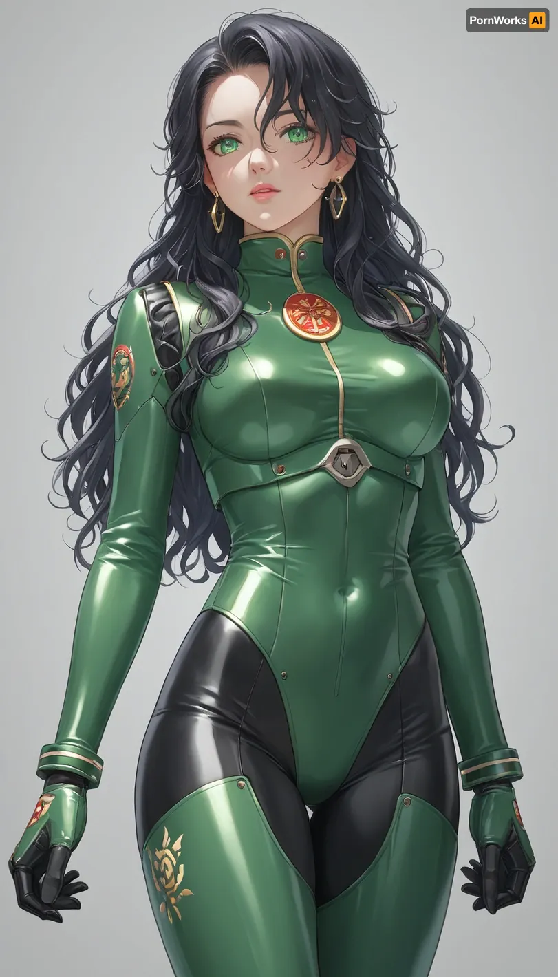 80s Anime cartoon show. 28 year old girl, she is tall, black long hair, stands beside her white and green mecha robot. She is in the process to get her soldier clothes on.
