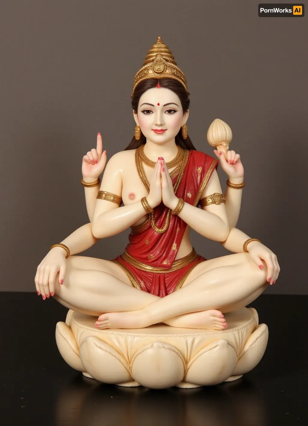Indian goddess Lakshmi, ivory statuette, sitting on a lotus flower, meditating, with white skin, in a red sari, with gold jewelry, (with four arms:1.7), (upper arms holding a lotus flower, lower arms folded in a prayer gesture 1.6), realistic lighting, clear image of the bone statuette.