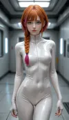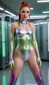 25 year old woman, red hair, green eyes, sidelocks, streaked hair, high braided ponytail, ginger hair, gradient hair, multicolored hair, pink tips, purple highlights, masterpiece, best quality, medium breasts, (latex:1.2), bodysuit, purple latex bodysuit, skintight, impossible bodysuit, female combatant, latex gloves, covered navel, neon green trim, neon green lines, expressionless face