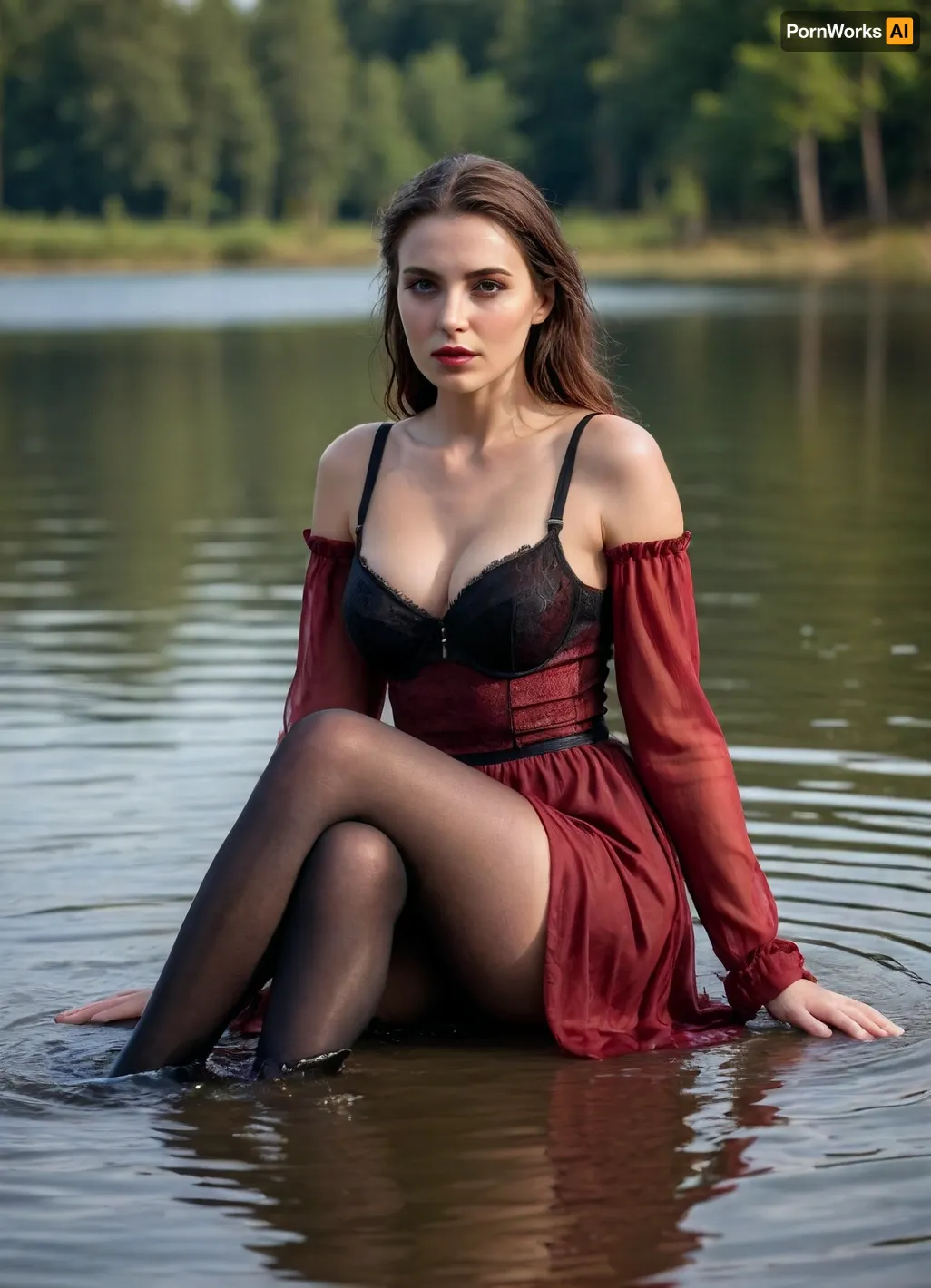 Wearing a long skirt, black bra, wet dark red stin blouse, black pantyhose, high boots, sitting in the lake, wet, clothes are very wet Wearing a long skirt, black bra, wet dark red stin blouse, black pantyhose, high boots, sitting in the lake, wet, clothes are very wet
