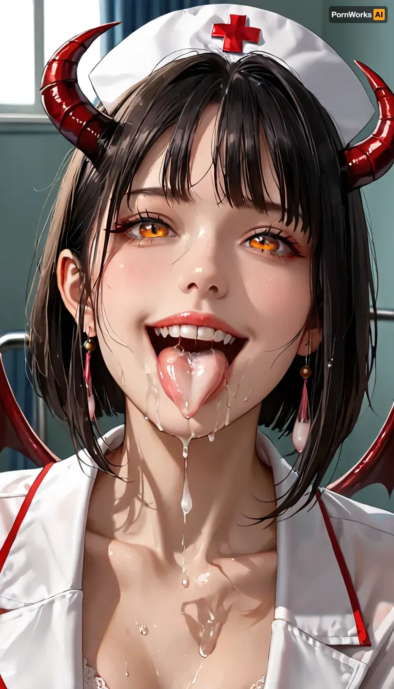masterpiece, best quality, highly detailed, (anime:1.2), BREAK, Close-up, ((a gorgeous 25 year old white succubus with demonic, wings, horns, tail)), (succubus has long black hair bob haircut), (wide open orange eyes), natural b cup boobs, (has a naughty grin expression), ((tongue out, the used cum filled condom balloon in her mouth, cum dripping from used condom onto her her lips and tongue)), slim, athletic, gymnast body, wearing a white nurse outfit, no panties, stockings, hospital, sitting, chair, (sitting on chair), leg over leg, dress up, skirt up, flash of beautiful wet pussy, pussy juice, (dark room:1.3), RAR, <lora:MeMaV3_ill:.5>, <lora:add_details_xl:.5>, <lora:Better Anime Backgrounds - [Background] - SDXL Version 1:.5>, <lora:RAR 0.4v:.5>