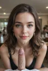 30 year old romanian tik tok model in a Thai Restaurant with many plants, facial, much cum on face, pov, submissive, beautiful smile, excited, sensual and seductive look, long flowing wavy tousled livht brown hair, Realistic, Babe, Photography, fully translucent Latex dress, cum, on, cloth, Full transparent latexdress