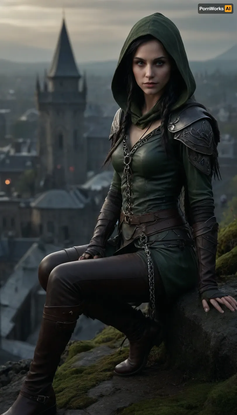 Sneaky female elf rogue, slender and agile, pale moonlit skin, long raven-black hair tied in a loose braid, piercing green eyes scanning the shadows, clad in dark leather armor reinforced with quiet chain, a hood partially concealing her face, twin daggers glinting faintly, crouched atop a moss-covered rooftop in an ancient elven city, faint mist curling around her boots, a faint smirk hinting at danger, cinematic low light, ultra-realistic fantasy art
