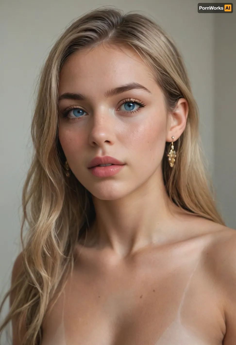 woman, 18 year old, Nude, blonde, sweet, tan lines, sunburnt, stunning blue eyes, always horny, athletic, big round ass, perfect face shape, beautiful lips, straight hair, body view, naturally beautiful, really athletic, earrings, huge boobs, super big boobs, long hair