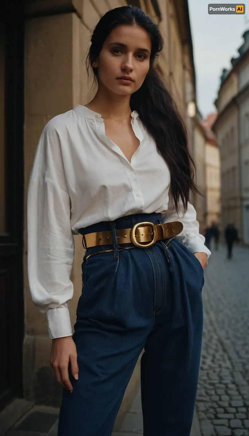 dark blue baggy paperbag slouchy jeans, very long hair, gold belt, prague, slouchy style, ponytail, black hair, white blouse