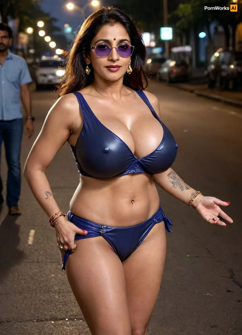 ((on the busy streets of Mumbai)), . FULL BODY PHOTO, entire body visible, 1 PHOTO, (moonlight shining from above), -------------------------------------------- indisc, tight jeans, very low-cut blouse, belly dance bra, moccasins, polarized sunglasses, ----------------------------------------------1 Kerala WOMAN, 55 years old, tall South Indian woman, very large full round breasts, tattooed arms, tattooed breasts, full lips, narrow nose, large round buttocks, big fat ass, braless, Wearing black tight leather clothes, possing.that, make, sense, with, Braless>, pn, round, breasts, Saree, Indian, <lora:bralessSDXL_v1_00022:1.9>, <lora:pn_UrbannaSprawl_SDXL_LORA_v06:.2>, <lora:round_breasts-XL-1.0:.8>, <lora:SDXL_MassiveCowsLoRA_v1:1.9>, <lora:XLSarees1:1.5>