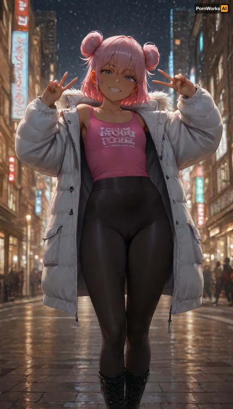 1girl, thin, nerdy, dark skin, smiling, pierced ears, bright gray eyes, short pink hair in a messy bun, open black winter coat, over sized pink tank top with flat chest and pokies, black leggings with camel toe, doc martens boots, standing, arm lifted with peace sign, outside, daytime, snowing, new york city street, cityscape, soft focus, realistic, detailed, high quality, high contrast, low light, highly detailed, rim lighting