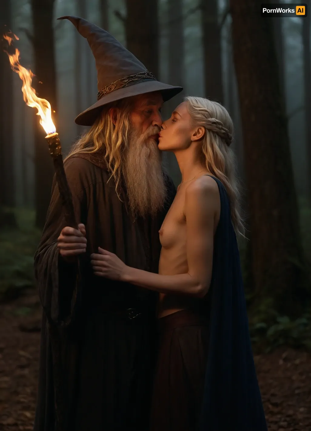 Ein großer Schuss eines ungleichen Paares steht bis heute vor einem geheimnisvollen alten Nebelwald. Die unterwürfige Elfenfrau, mit flachen, blonden Dreadlocks und perfektem Gesicht, blauen Augen, küsset einen alten Perversen Gandalf the Grey, der sein typisches Kostüm und seinen Hut trägt. Flammende Fackeln beleuchten die Szene, wenn das Paar in die dunklen Tiefen des alten Waldes verschwindet.