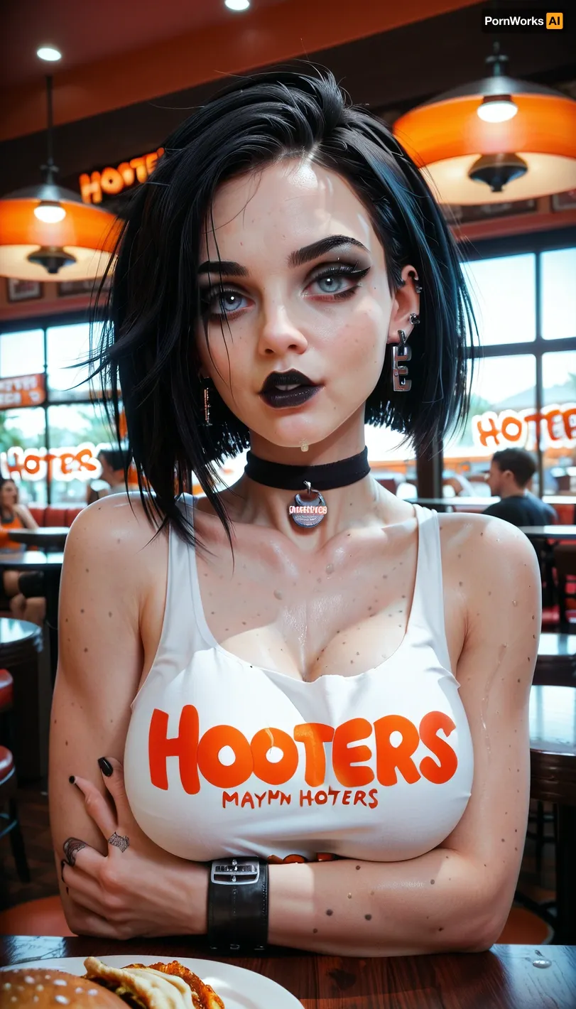 Die perfekte Frau trat in das Restaurant, ihre goth ästhetisch auffällig und dennoch elegant. Sie trug einen schwarzen Choker mit einem schlanken Design und ergänzte ihren Gesamt Look. Die Atmosphäre schwärmte mit Energie, als sie ihren Sitz nahm, die Augen scannten den Raum mit Neugier. Auf Hooters wurde jeder Blick mit Wertschätzung erfüllt, aber sie blieb komponiert und wusste, dass ihre Präsenz unvergesslich war.