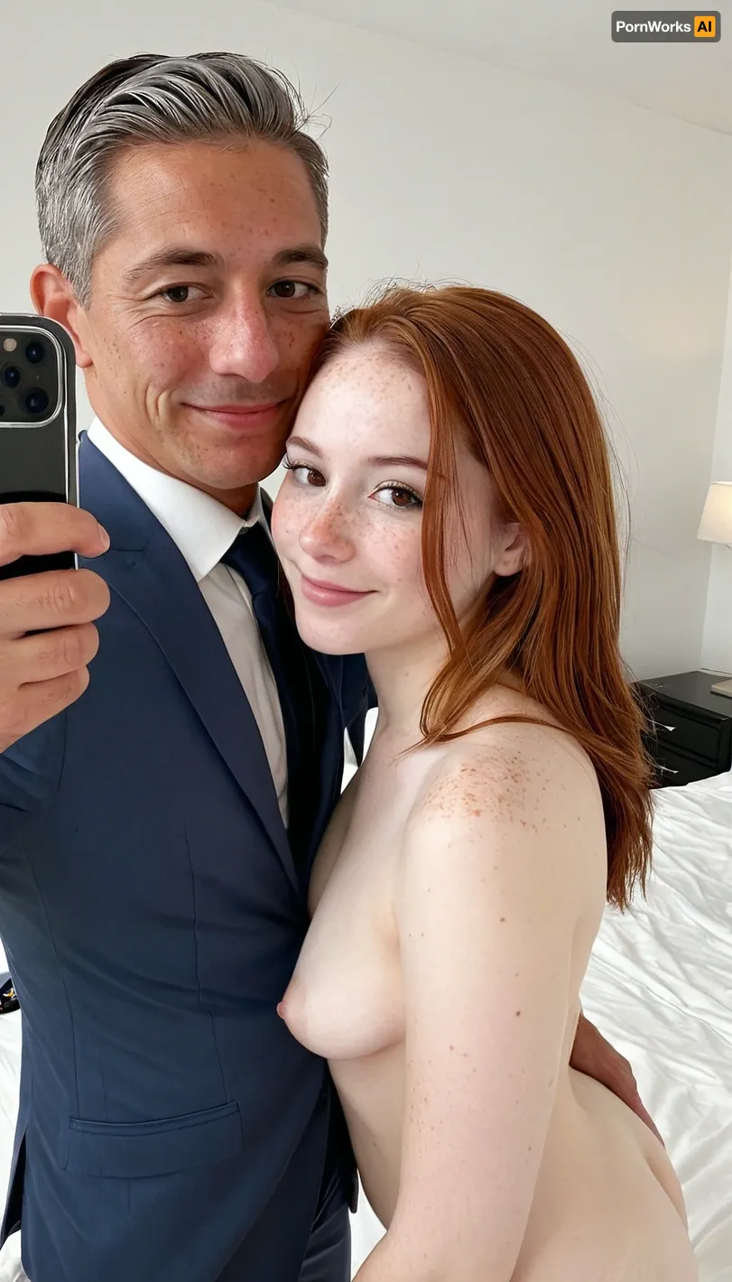 18 years old Mexican-american woman and her well dressed 50 years old husband, hugging taking a selfie, white and pale skin, naked, small areolas, slim nose, brown hair, small sagging breasts, embarrassed smile, round face, minimalist white luxury room, freckles, brown eyes, man is wearing a formal suit, molar on cheek, 3/4 body view, rhinoplasty, hyper realistic photo, full hd, 8K
