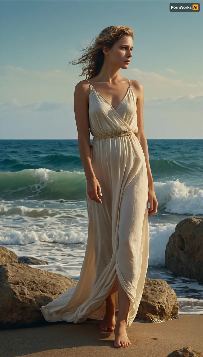 Odysseus' wife Penelope is waiting for him on the ocean shore, full height, aesthetics of the female body, oil painting, hyperrealism, Mika Smytsk style. Odysseus' wife Penelope is waiting for him on the ocean shore, full height, aesthetics of the female body, oil painting, hyperrealism, Mika Smytsk style.