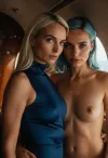 a photo of a 35 year old, (platinum blonde), woman, (naked), (shaved pussy), (with another different woman 25 years old with, (blue), hair and blue clothes, embracing intimately), small, (narrow hips, slim fit body), (beautiful normal breasts), in a private jet, (cinematic), dark, high contrast, intricately detailed eyes, real, (skin textures), light reflections in the eyes, detailed eyebrows, real skin texture, slight skin blemishes, imperfect skin, skin pores, blush, goosebumps, translucent skin, subsurface scattering, slight fine wrinkles