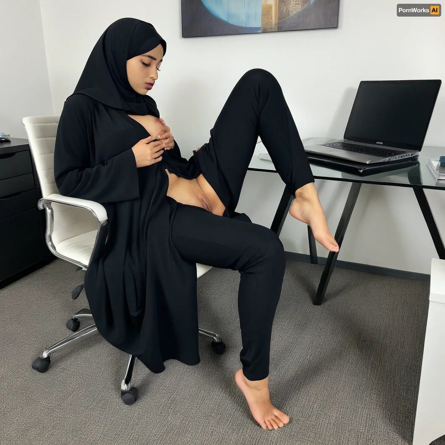 A photo captures a moment of relaxation as a naked Arab Muslim woman in a black hijab and abaya receives a foot massage in a modern office. She sits comfortably on a chair, her bare feet visible, while she focuses on her laptop, showcasing both her professional dedication and the simplicity of the act.
