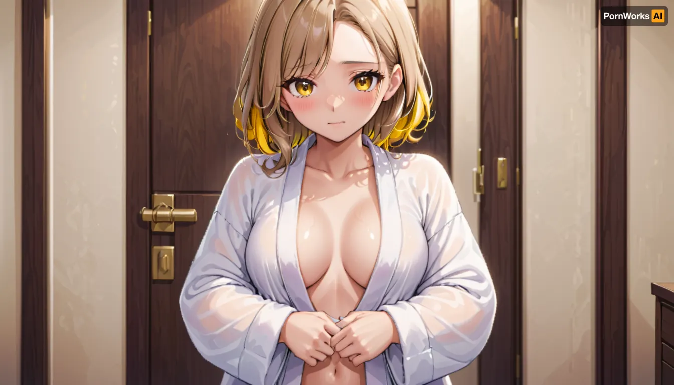 Shy girl next door, she has perfect huge tits. Long light brown hair with golden highlights. Wearing white bathrobe, view to the front