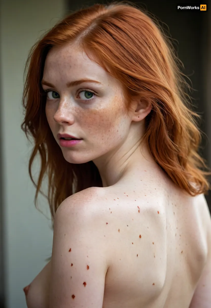 rear view, very beautiful flame redhead, young, long straight hair, pointed triangle face, uneven messy hairstyle, large bright green eyesю slightly snub-nosed, ((freckles)), big mouth, red plump lips, pointed chin, naive surprised look, view from behind, naked back, glance over her left shoulder, eye contact, looking onto viewer, waist up portrait rear view, very beautiful flame redhead, young, long straight hair, pointed triangle face, uneven messy hairstyle, large bright green eyesю slightly snub-nosed, ((freckles)), big mouth, red plump lips, pointed chin, naive surprised look, view from behind, naked back, glance over her left shoulder, eye contact, looking onto viewer, waist up portrait