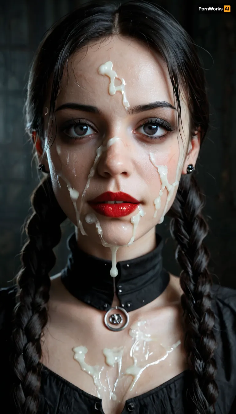 A stunning woman, with long black braided pigtails and a high collar gothic top, stands confidently in the moonlit mansion. Her huge dark eyes, sharp and intense, lock onto the camera with a look of pride. A perfect lighting casts her features in sharp detail, highlighting every pore of her young, natural skin. Strings of thick cum splashed across her face, leaving a sticky residue that glistens under the moonlight. She exudes an eerie presence, as if she's a character from a gothic tale.