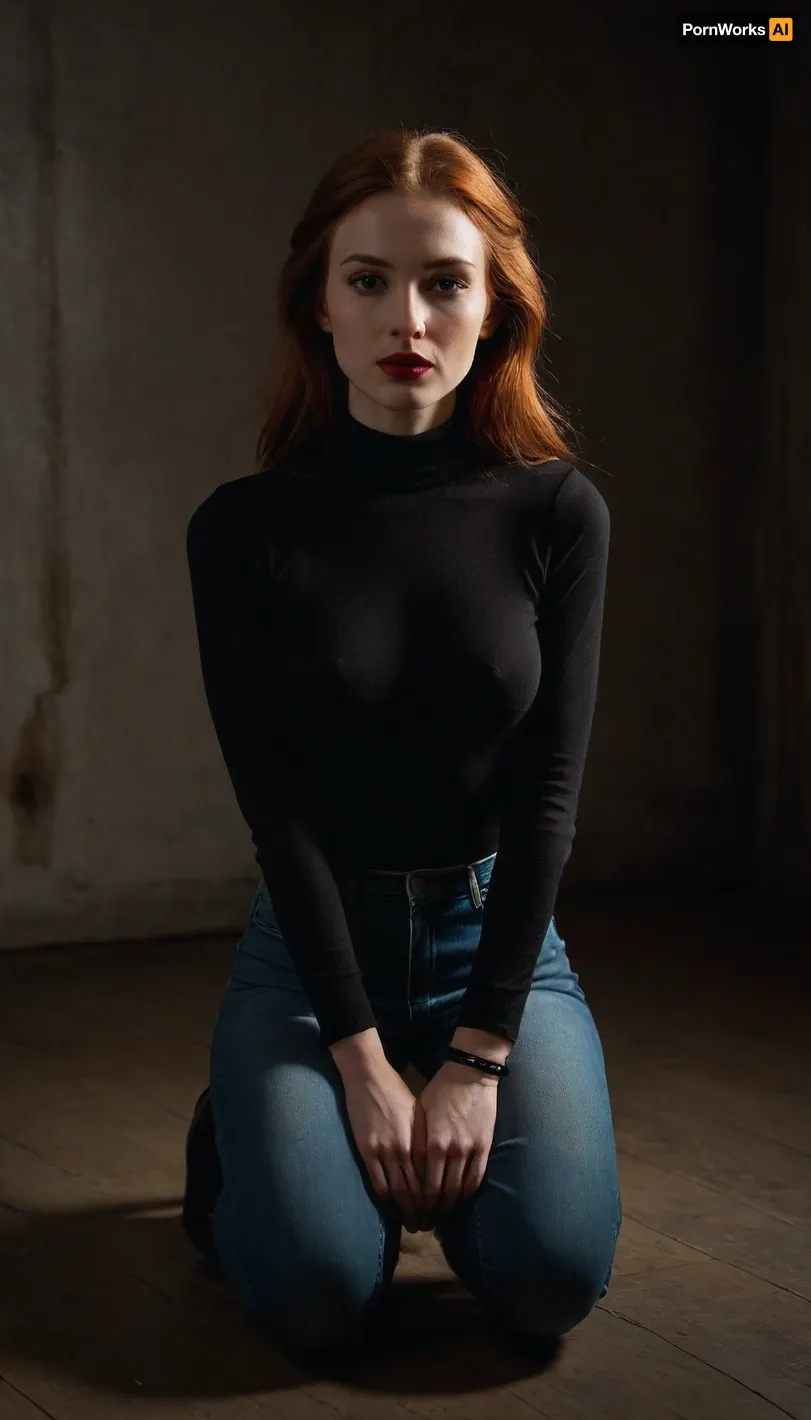 Very pretty and beautiful 25yo slim girl. Imperfect face. Scared and humiliated look. Tall. Redhead. Cheekbones. Sharp chin. Full body view. Wearing casual tight clothes. Straight hair. Casual dark clothes. In the bdsm dungeon. Red lipstick. Wearing brown tight turtleneck. Blue jeans. Black shoes. Down on the floor on her knees. Hands cuffed. Hands tied together. Kneeling.