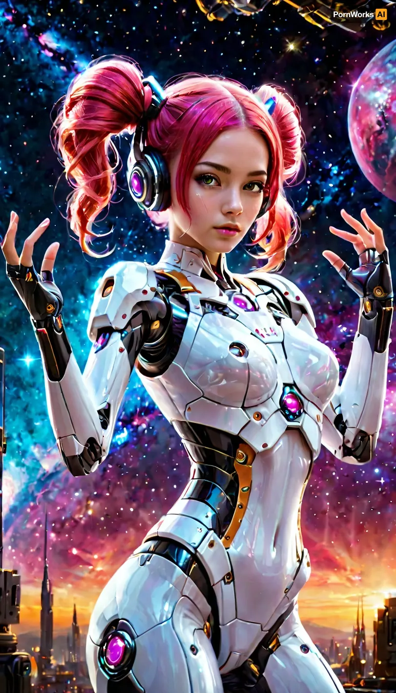 Realism, Gorgeous android woman, (((full body))), ((android mecha body parts costume:1.3)), best quality, photorealism, intricate details, realistic face, detailed face, full view, sfw, ((dancing with hands up:1.4)), ((gelco glossy skin)), ((cosmos nebula space background)), perfect picture, ((neon glowing hair)), ((twin tails hair with drills)), masterpiece, professional photography, high quality, ultra detailed, UHD 8K, extreme realism, <lora:add-detail-xl:2>, ((detailed eyes)), maximum detail, Robot, Skin, Android, <lora:robot_skin_XL_1.0.6:.2> Realism, Gorgeous android woman, (((full body))), ((android mecha body parts costume:1.3)), best quality, photorealism, intricate details, realistic face, detailed face, full view, sfw, ((dancing with hands up:1.4)), ((gelco glossy skin)), ((cosmos nebula space background)), perfect picture, ((neon glowing hair)), ((twin tails hair with drills)), masterpiece, professional photography, high quality, ultra detailed, UHD 8K, extreme realism, <lora:add-detail-xl:2>, ((detailed eyes)), maximum detail, Robot, Skin, Android, <lora:robot_skin_XL_1.0.6:.2>