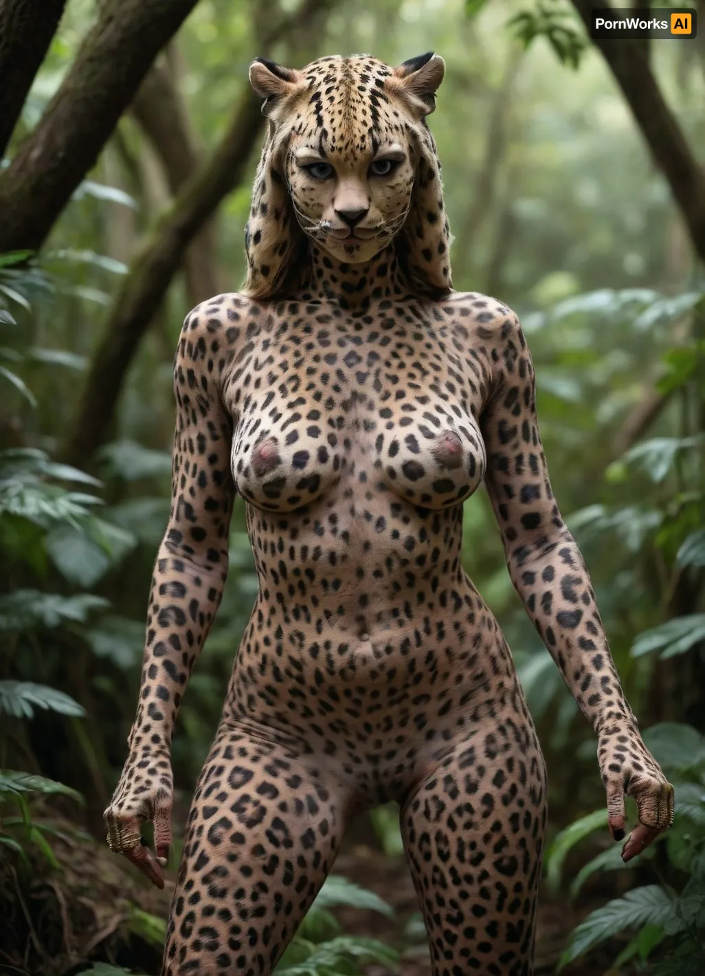 Full Body view of beautiful anthropomorphic Leopard Woman, beautiful human female face, face covered in Leopard spots, naked, nude, whole body covered in Leopard spots, (whole Body covered in Leopard spots:1.5), leopard tail, full Body visible, Standing in jungle, pussy spread wide Full Body view of beautiful anthropomorphic Leopard Woman, beautiful human female face, face covered in Leopard spots, naked, nude, whole body covered in Leopard spots, (whole Body covered in Leopard spots:1.5), leopard tail, full Body visible, Standing in jungle, pussy spread wide