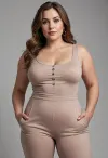 She wears a white sleeveless t-shirt made of soft cotton blend fabric. The neckline is a deep scoop, showing her collarbones safely. The waist is cinched with a gentle elastic band, creating soft gathers in the fabric. Her highwaist blue jeans are form fitting and tailored to fit her, draping naturally over her hips and thighs. The outfit is styled tastefully, emphasizing comfort, maturity, and body-positive realism.