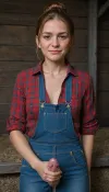 beautiful sexy slender 25 year old woman posing, (masturbating:1.4), denim overalls, flannel shirt, no makeup, Brown eyes, hair bun, ginger hair, cowboy shot, farm, perfect hands, perfect fingers, (erect penis), (futanari:1), (surprised face:1.5), (covered in cum:1.6), <lora:MJ52_v2.0:1>