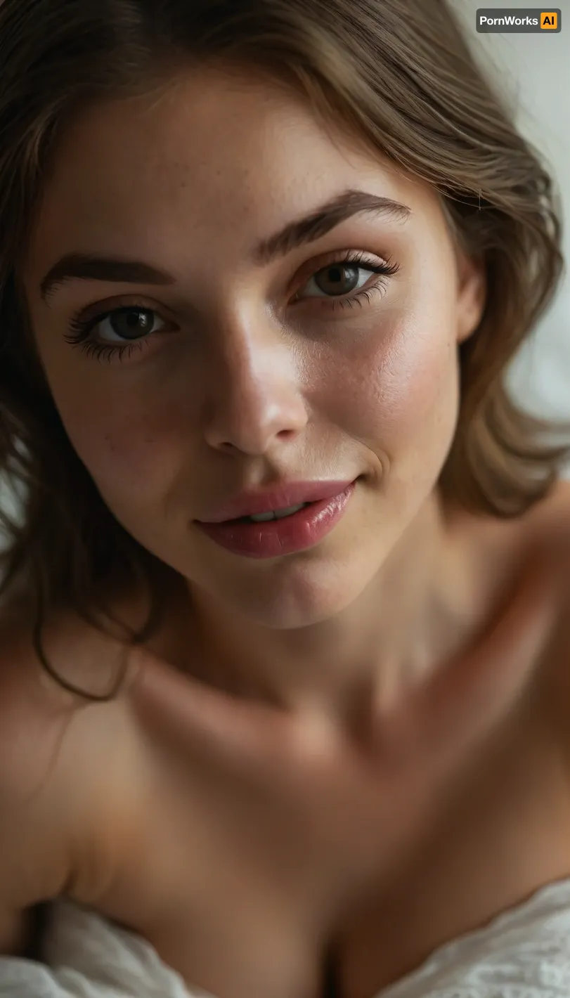 ziprealism, (full sensual lips, moist lips, glossy lips:1.4), (sensual suggestive smirk, adorable dimples, playful expression, heartbreaking beauty, raised eyebrow:1.6), (intimate avant-garde experimental photography, dramatic lighting), (sharp focus on eyes, loose closeup, low angle), (soft romantic lighting, light bloom, shallow depth of field, soft bokeh, layered composition with subtle foreground, soft vignette, vintage analog lens), (goosebumps, vellus hairs, subsurface scattering, freckles, sharp contrasting limbal rings:.4), (natural skin texture, maximum quality skin texture), (intimate seduction, pale breasts, pale nipples:1.4), (cozy bedroom scene), <lora:style_lora_realis:.8>