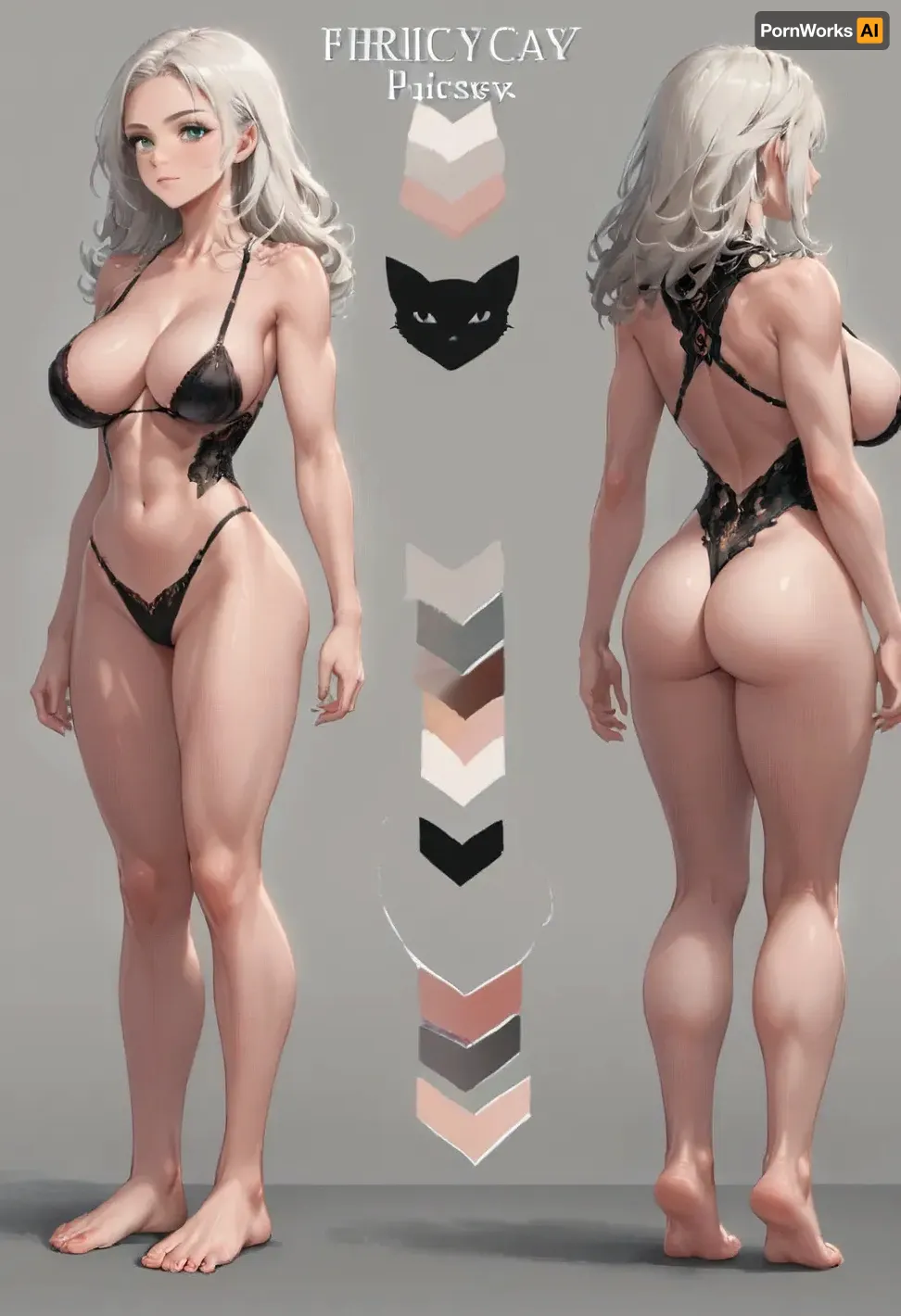 Felicia black cat, character reference sheet, woman, ATHLETIC BODY, WIDE LEGS, BIG BREASTS, DETAILED FEET, pose intact, character design sheet, ((1 front view, 2 side view, 3 back view)), a wonderful designer, 8k resolution, Ultra HD image output.