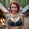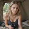 young woman at a festival modern Campsite, Reddened from alcohol, horny, smiles at the camera