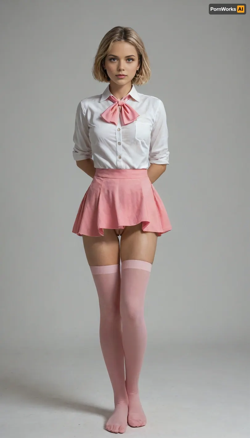 masterpiece, best quality, very awa, very aesthetic, newest, thick outlines, very detailed, 1girl, solo, standing, beautiful, cute, kawaii, Elle, adult face, short blonde bob cut, big blue eyes, beautiful face, toned body, white unbuttoned shirt, tits visible, ascot, pink mini skirt, pink mini-skirt, upskirt, no underwear, pussy visible, pink thighhighs, hair bow, highly detailed, intricate, cute pose, modelshoot, abstract background, petite, perfect body, medium perky tits, sexy pose, erotic, seductive, medium perky breasts, innie pussy, cowboy shot, shadows, dynamic angle, dutch angle, dramatic lighting, cinematic lighting, full body view masterpiece, best quality, very awa, very aesthetic, newest, thick outlines, very detailed, 1girl, solo, standing, beautiful, cute, kawaii, Elle, adult face, short blonde bob cut, big blue eyes, beautiful face, toned body, white unbuttoned shirt, tits visible, ascot, pink mini skirt, pink mini-skirt, upskirt, no underwear, pussy visible, pink thighhighs, hair bow, highly detailed, intricate, cute pose, modelshoot, abstract background, petite, perfect body, medium perky tits, sexy pose, erotic, seductive, medium perky breasts, innie pussy, cowboy shot, shadows, dynamic angle, dutch angle, dramatic lighting, cinematic lighting, full body view