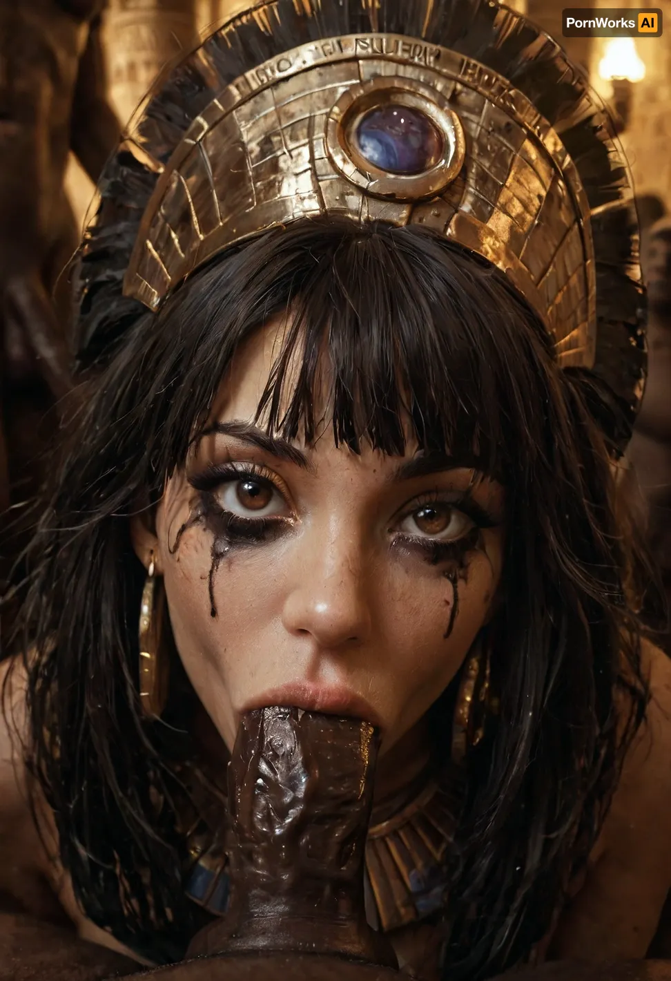 In a dark underworld scene, an evil pale woman with bright brown eyes and heavy Egyptian makeup glared daggers from her wide eyes. Her gold makeup glistened in the fire lighting as she towered over a group of Egyptian men with intricate egyptian headdress. A low blowbang sound echoed through the chamber filled with statues, her presence commanding and intense. Her lips curved into a dangerous smile, revealing a deepthroat that seemed to swallow the room's silence whole. The Egyptian tattoo on her arm depicted ancient symbols, intertwining with the dark underworld theme, her expression both haunting and mesmerizing as she looked directly at the viewer from a random angle, letting it burn.