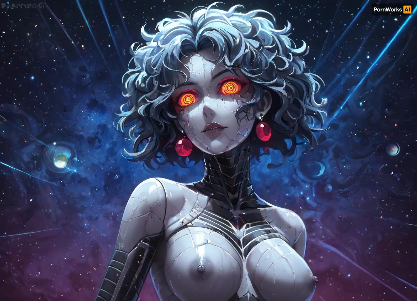 Dark death nude android girl Yumi Kuroda dancing with the Galaxy, deep space, scale metal skin, <lora:aesthetic_anime_v1s:.8>, psychedelic, art, drdjns, style, <lora:drdjns:.8>