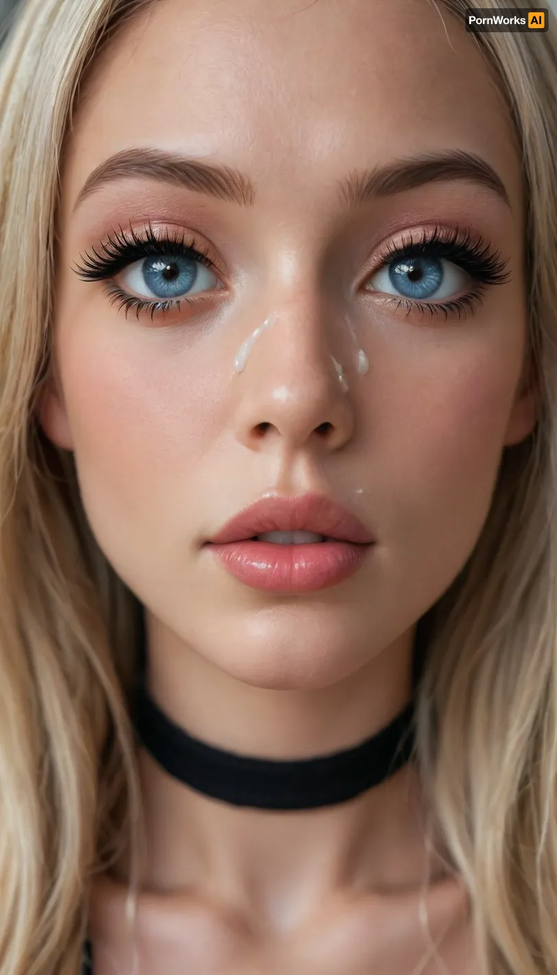 instagram photo, (close-up face:1.8), 18 y.o., slut, blonde hair, very long hair, big lips, beautiful face, black choker, extra detailed, high definition, (boobs:1.2), (blue eyes), (glamorous slut makeup:1.5), (((very very big long eyelashes:1.4))), (ab crack), ((wet Skin)), ((cum on face)), choker, covered long erect nipples, (in the bad), ((erotic pijamas:1.7)), shadows, bright light patches, light caustics, (Dynamic angle:1.5), round breasts, hard nipples, narrow waist, (big tits:1.3), (small butt:1.5), ((very skinny:1.5)), tears, short body, realistick, <lora:melanin-XL:1.3>