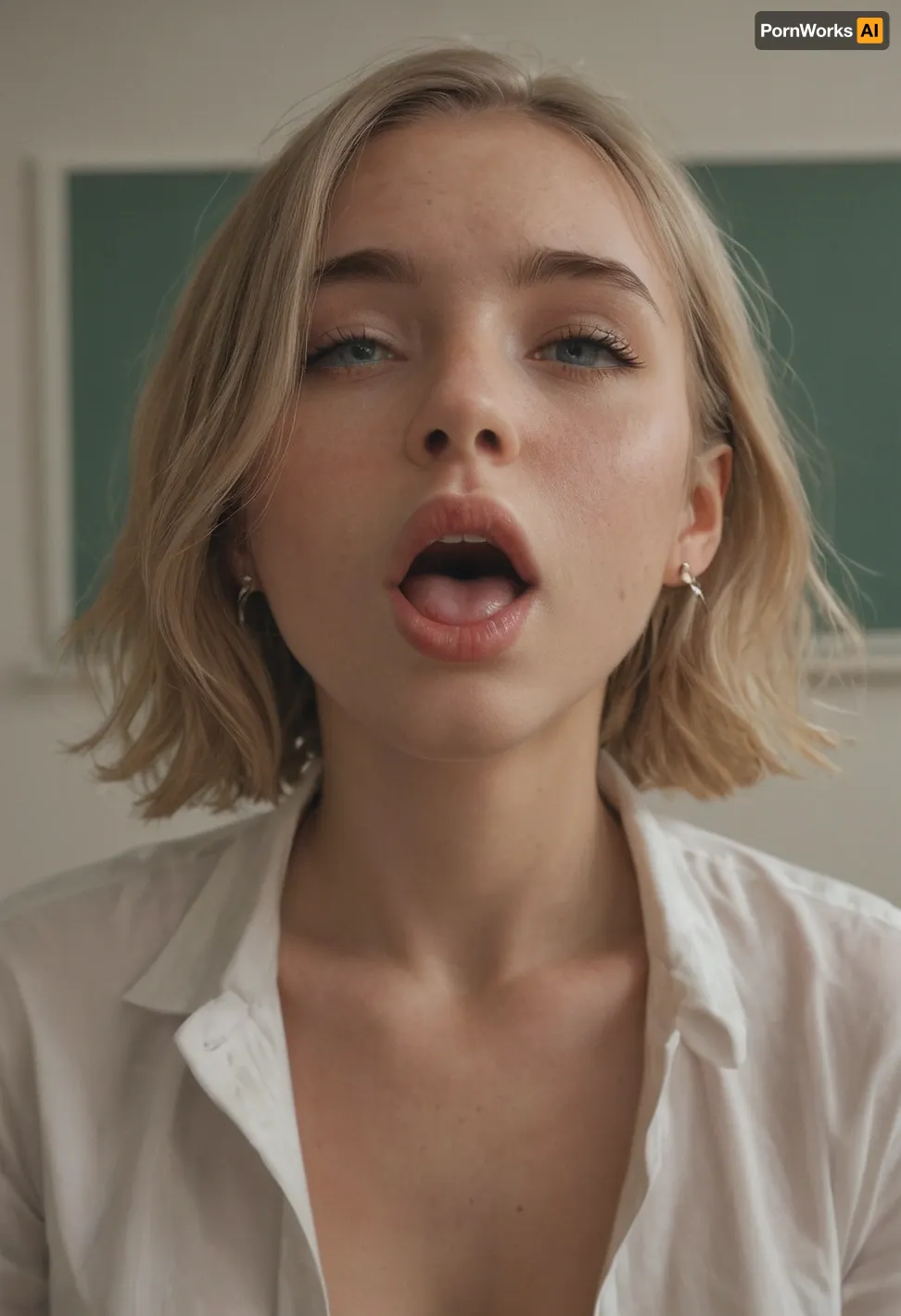 19 year old, nice firm tits, very horny face, in a classroom, mouth open a drooling