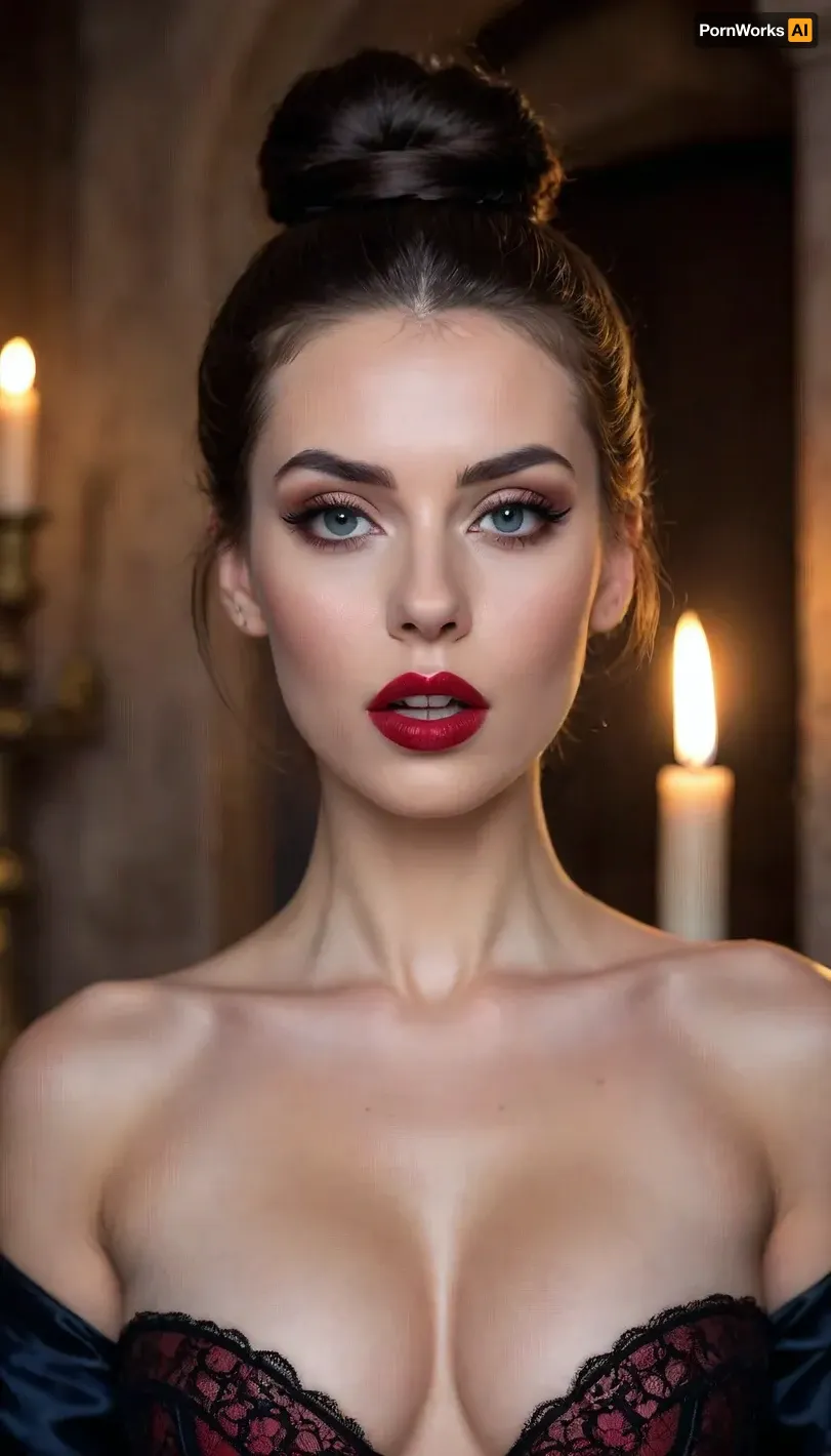 a hyper realistic ultra detailed photograph of a beautiful naked adult woman in a castle at sunset, Nordic headmistress with shiny black hair, (((hair bun))), perfect face, perfect nose, full lips, (very pale skin), (white skin), very sexy, fashion pose, detailed symmetric beautiful eyes, detailed gorgeous face, ((castle luxurious interior)), light from fireplace, exquisite detail, skinny body, (naked), front view, (gothic makeup), red lipstick, long eyelashes, erect detailed nipples, cleavage, breasts, (close up view), ((very dark areolas)), gorgeous breasts, (nipples visible), black vampire, vampire teeth, (((open mouth))), (((vampire fangs))), burning candles, (darkest), Hyper Smoke, background, black, backlit, theme, Dark Fantasy, dark, nipples, wearing glasses, pale skin, blue lipstick, (full frame view), angry attitude, arrogant attitude, dominant face, bitchy face, ((Looks disapproving at the camera:1.3)), looking very angry and upset at the camera view, looking at the viewer, intense stare, look at the viewer, eye contact, looking at camera a hyper realistic ultra detailed photograph of a beautiful naked adult woman in a castle at sunset, Nordic headmistress with shiny black hair, (((hair bun))), perfect face, perfect nose, full lips, (very pale skin), (white skin), very sexy, fashion pose, detailed symmetric beautiful eyes, detailed gorgeous face, ((castle luxurious interior)), light from fireplace, exquisite detail, skinny body, (naked), front view, (gothic makeup), red lipstick, long eyelashes, erect detailed nipples, cleavage, breasts, (close up view), ((very dark areolas)), gorgeous breasts, (nipples visible), black vampire, vampire teeth, (((open mouth))), (((vampire fangs))), burning candles, (darkest), Hyper Smoke, background, black, backlit, theme, Dark Fantasy, dark, nipples, wearing glasses, pale skin, blue lipstick, (full frame view), angry attitude, arrogant attitude, dominant face, bitchy face, ((Looks disapproving at the camera:1.3)), looking very angry and upset at the camera view, looking at the viewer, intense stare, look at the viewer, eye contact, looking at camera