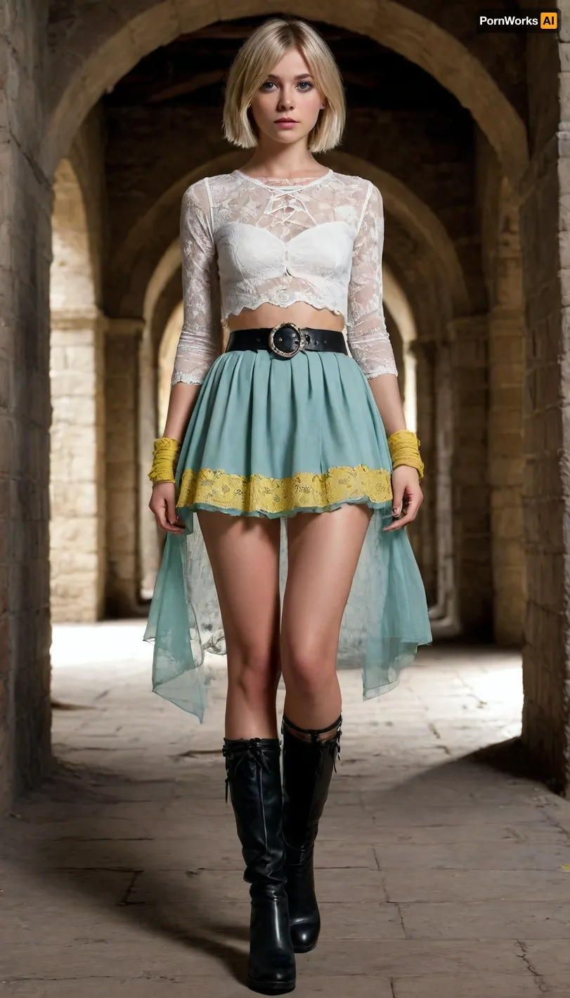 1 Girl, (25 Years old, FULL BODY, Clonated face), (Skinny, Slim body), (Light blue eyes, Glowing eyes), (Short hair, Bob cut, Blonde), (In A Dark Dungeon), (See-through white lace top, wide black belt with yellow flower, long open dark green skirt, knee-high gladiator lace-up boots), (Extrem long shot, Panoramic shot of her, FULL BODY), flat, chested, <lora:flat_chested_v3.5:1.4> 1 Girl, (25 Years old, FULL BODY, Clonated face), (Skinny, Slim body), (Light blue eyes, Glowing eyes), (Short hair, Bob cut, Blonde), (In A Dark Dungeon), (See-through white lace top, wide black belt with yellow flower, long open dark green skirt, knee-high gladiator lace-up boots), (Extrem long shot, Panoramic shot of her, FULL BODY), flat, chested, <lora:flat_chested_v3.5:1.4>