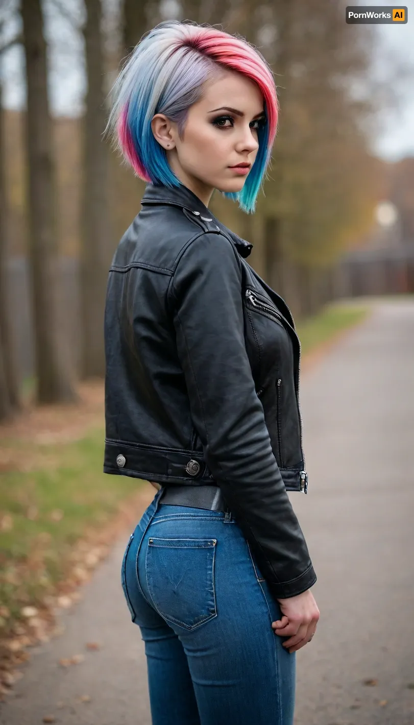 3/4 view portrait, (4K UHD ultra-detailed RAW photo), high detailed, 8k, (photorealistic:1.7), sad emo girl, cute 18 yo girl, (topless), small tits, ((black leather jacket)), ((boots)), (gothic makeup), ((multicolor haircut)), ((jeans)), ((looking on viewer)), style, hair, dip, dyed, black, to, red, white, blue, blonde, from behind 3/4 view portrait, (4K UHD ultra-detailed RAW photo), high detailed, 8k, (photorealistic:1.7), sad emo girl, cute 18 yo girl, (topless), small tits, ((black leather jacket)), ((boots)), (gothic makeup), ((multicolor haircut)), ((jeans)), ((looking on viewer)), style, hair, dip, dyed, black, to, red, white, blue, blonde, from behind