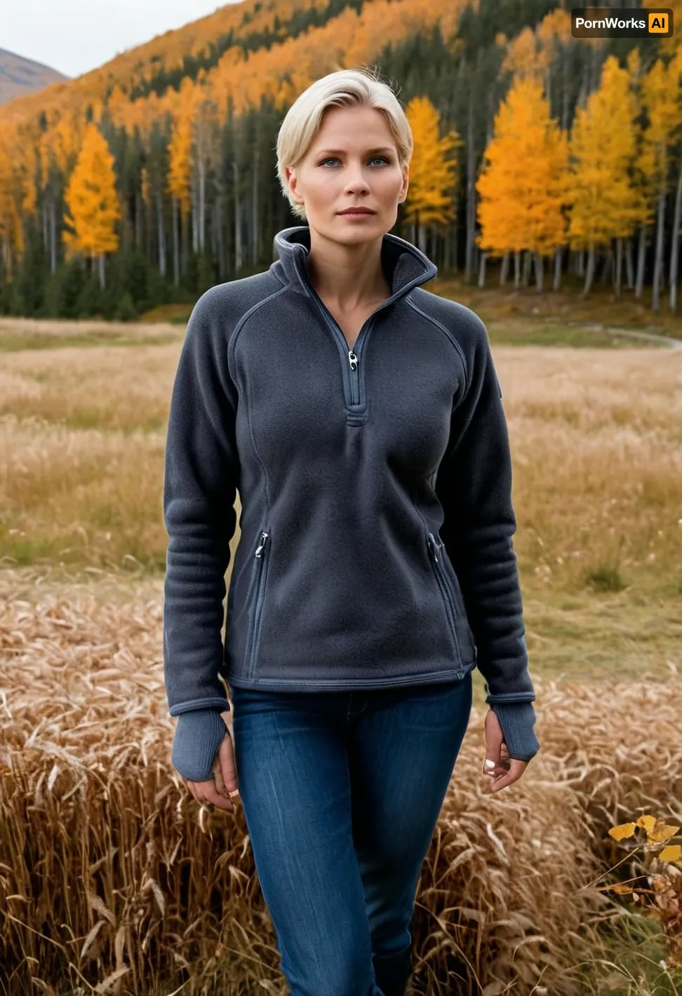 (masterpiece, best quality:1.2), 1 girl, swedish film character Rebecka Martinsson, solo, blue jeans, (anthracite fleece troyer, long sleeves:1.4), dark grey open hooded windbreaker, outdoors, white blonde hair, bright ice blue eyes, short haircut with side parting, hair tucked behind ears, Standing in autumn swedish fjell landscape, she looks into the distance, serious look, photorealism
