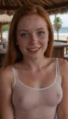 pov shot across a wooden table with delicious fish dishes and piña coladas at a beach bar with bast roof in Costa Rica, sitting across a tall redhead 30yo Scandinavian redhead woman, mid-length red hair falling loosely down in front of her and a big brushed side-bang, she is tilting her head and smiling lovingly with open mouth and squinting her eyes, fair skin with many freckles and a big nose, square shaped face, she is wearing a loose tank top with big stripes of petroleum-color and white, she is pulling down her top revealing her huge and heavy detailed ultra-sagging saggy gigantic titties with thick nipples and large areolae, tanlines, best realism, sunny midday, blurry background with a few other guests and the outdoor bar, large, big, boobs, huge, tits, <lora:bombshell_v2:1.2>, <lora:shirtsqueezev2_SDXL:.6> pov shot across a wooden table with delicious fish dishes and piña coladas at a beach bar with bast roof in Costa Rica, sitting across a tall redhead 30yo Scandinavian redhead woman, mid-length red hair falling loosely down in front of her and a big brushed side-bang, she is tilting her head and smiling lovingly with open mouth and squinting her eyes, fair skin with many freckles and a big nose, square shaped face, she is wearing a loose tank top with big stripes of petroleum-color and white, she is pulling down her top revealing her huge and heavy detailed ultra-sagging saggy gigantic titties with thick nipples and large areolae, tanlines, best realism, sunny midday, blurry background with a few other guests and the outdoor bar, large, big, boobs, huge, tits, <lora:bombshell_v2:1.2>, <lora:shirtsqueezev2_SDXL:.6>