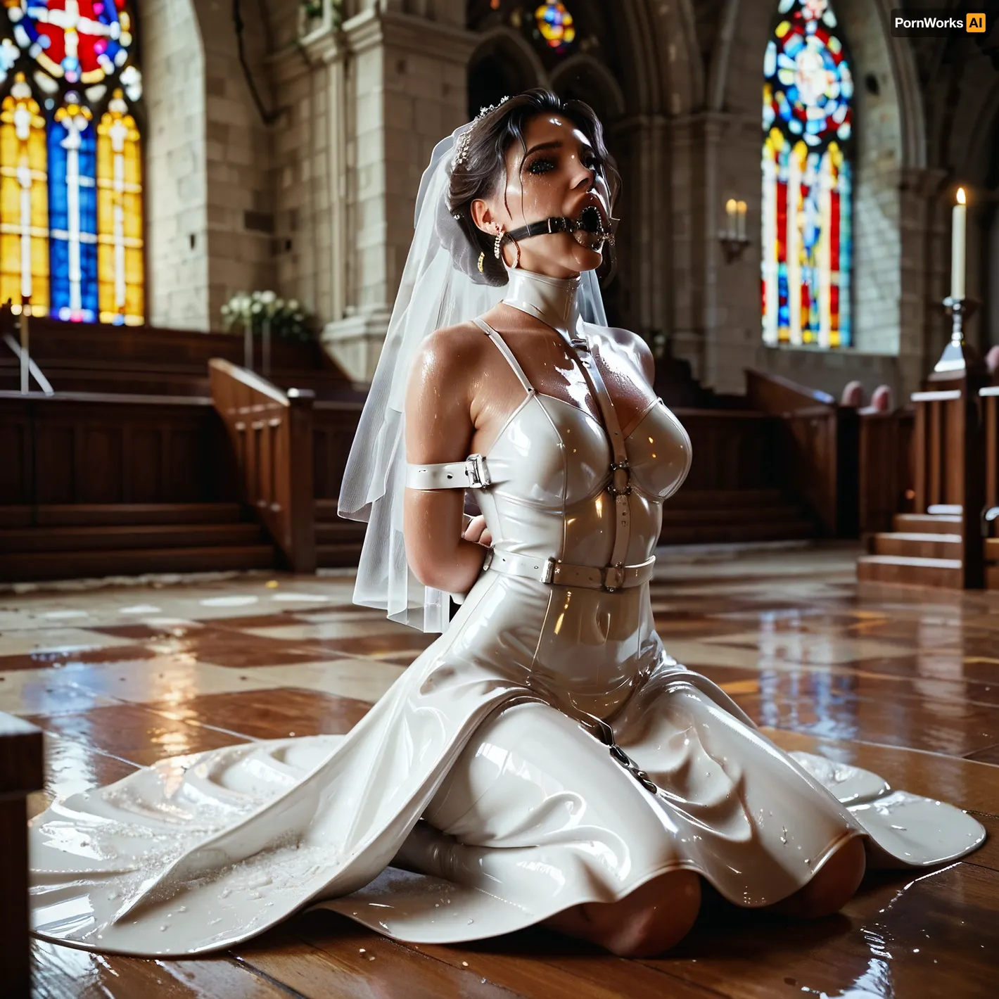 bride in latex dress, hands tied behind her back, ring gag in her mouth, wet body, kneeling in church.