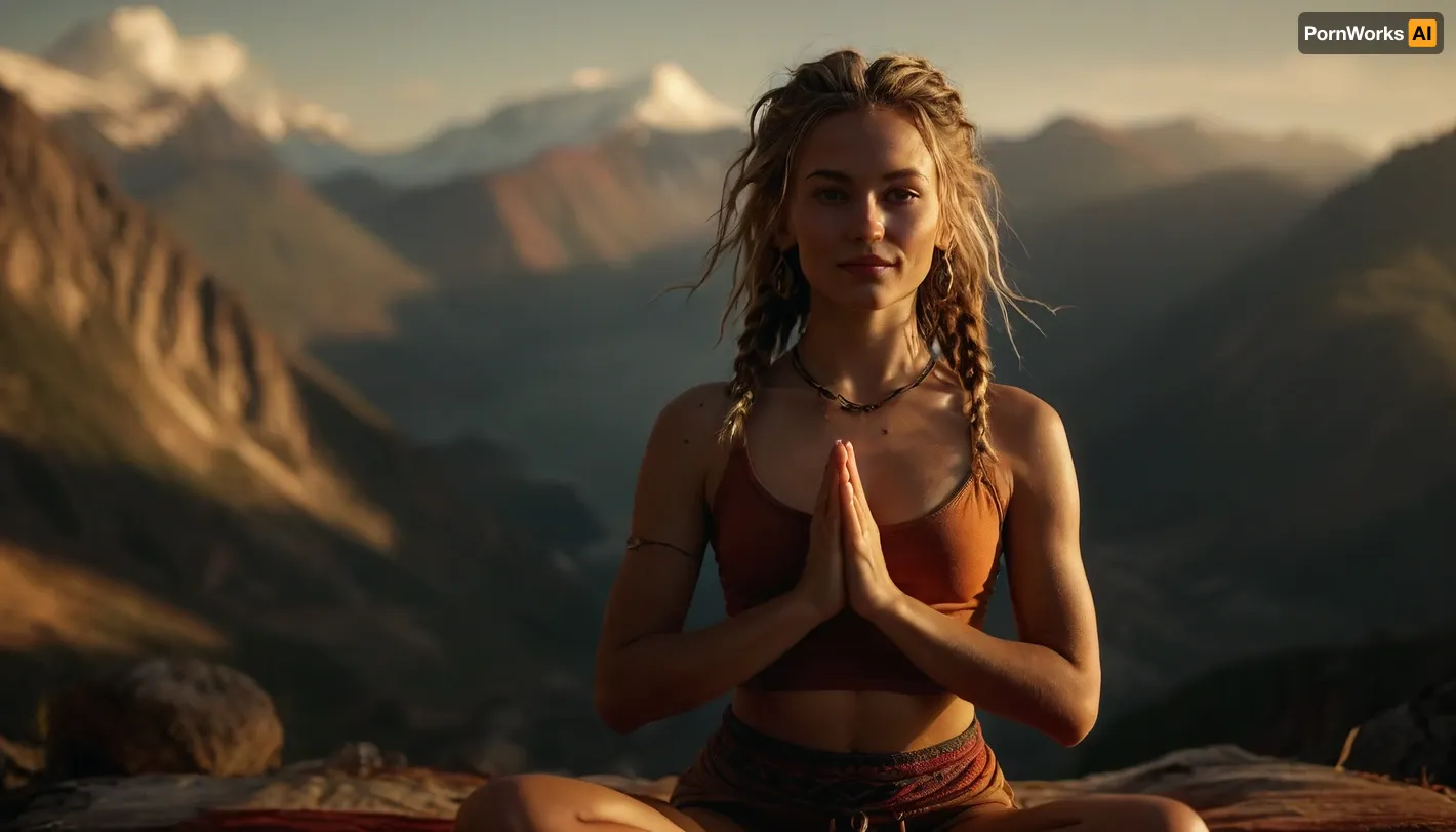 Una rubia delgada y plana hace yoga de la mañana contra el telón de fondo de las montañas tibetanas, su expresión serena que coincide con la calma del amanecer. La luz suave mejora su belleza natural mientras ella posa con gracia, sus temibles capturando el rocío de la mañana. Su postura perfecta y su apariencia acogedor crean un sentido de paz y armonía en el ambiente pacífico.