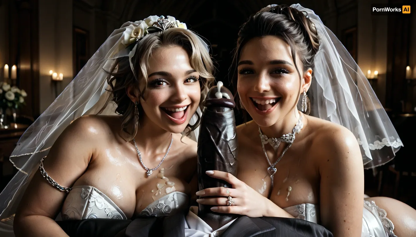 interracial, pov of black penis, (((1white cuckold husband in suit is behind the bride hugging the bride he is happy and look at the camera1.5))), very large black penis, The happy chubby white bride with dirty blonde hair in sexy wedding dress, cum driping bride's chain' cum driping from black penis, drinking sperm from transparent glass cup, there is glossy and sticky sperm in cup, cup full of sperm, cum swallowing, ((gokkun)), cum dripping from the corners of her lips, The woman holds the cup under the black cock., happy, <lora:671410_training_data:.4>, <lora:dark:.5>, <lora:677862_training_data:.8>, <lora:happy_v2:1>