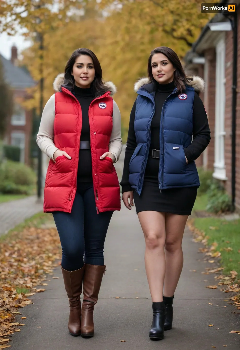 ((2 girls)), Two Pakistani MILFs, ((sbbw, snatched waist, big booty)), ((Pakistani clothing, Canada goose gillet, heels)), UK school run