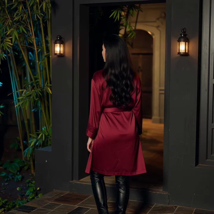 in luxurious bordello, red accents, luxury suite, native VIETNAMESE woman, dark tanned skin, Young VIETNAMESE, Neptune massage BANGKOK, (solo:1.3), Full Body view from the Front, 18-year-old woman, THAI, dark shoulder length straight hair, (mirror selfie in hotel room suite), burgundy turtleneck dress, black opaque pantyhose, boots, mirror, selfie, holding