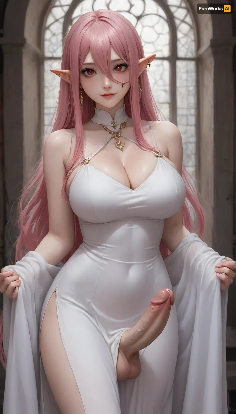 1girl, breasts, cleavage, dress, long hair, looking at viewer, smile, solo, pointy ears, blush, large breasts, red eyes, pink hair, very long hair, monster gir, mole, mole under eye, jewelry, hair between eyes, earrings, single earring, facial mark, side slit, slit pupils, tight dress, hobble skirt, tight clothes, dongtan dress, elf, ears, sousou, no, frieren, penis, futanari, erected penis, testicles, big testicles, penis under dress, the dress covers the penis, cum seeps through the fabric of the dress, <lora:milkers_v2:1.4>, <lora:sousouNoJayNL:.5>, <lora:209970_training_data:.5> 1girl, breasts, cleavage, dress, long hair, looking at viewer, smile, solo, pointy ears, blush, large breasts, red eyes, pink hair, very long hair, monster gir, mole, mole under eye, jewelry, hair between eyes, earrings, single earring, facial mark, side slit, slit pupils, tight dress, hobble skirt, tight clothes, dongtan dress, elf, ears, sousou, no, frieren, penis, futanari, erected penis, testicles, big testicles, penis under dress, the dress covers the penis, cum seeps through the fabric of the dress, <lora:milkers_v2:1.4>, <lora:sousouNoJayNL:.5>, <lora:209970_training_data:.5>