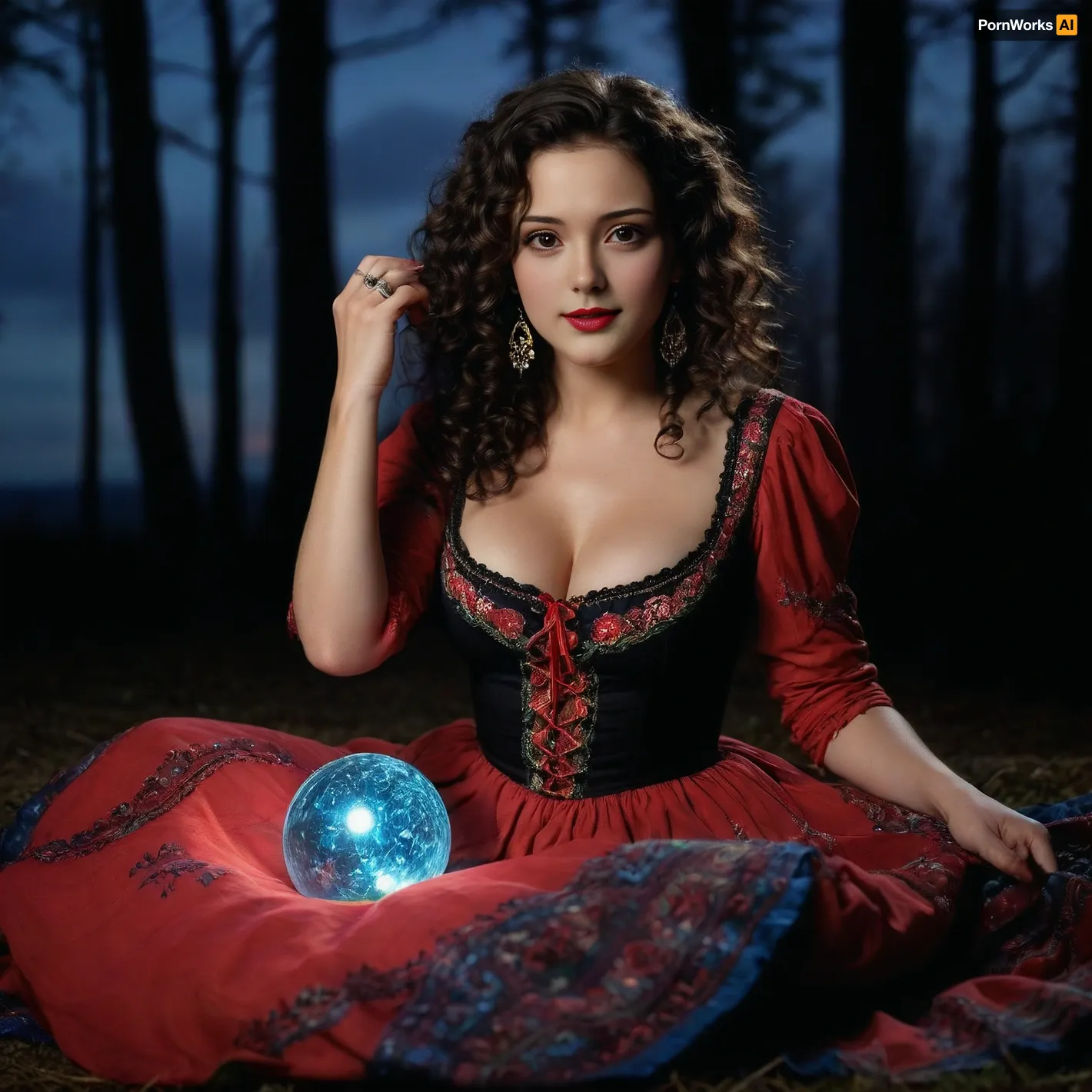 Gypsy woman with a pronounced gypsy appearance, dressed in a traditional gypsy dress with bright patterns, laying on stomach by the blue fire in the night forest. Laughing, with bright features, dark skin, eyes Large, thick red lips, expressive, black, Look deep, with a touch of mystery. Wide, bushy eyebrows of natural shape, full red lips, emphasized by bright red lipstick. Thick medium curly hair of dark brown color. Long, puffy skirt of bright colors, unbuttoned blouse, loose cut, with embroidery, lace or shiny elements. Bilye jewelry, large earrings, bracelets, rings, beads. Bright scarf tied on the head. On the feet of boots with bright embroidery. Her blouse is unbuttoned, showing a large beautiful breasts, lewd, sexy, liberated pose, Background, dark sky with aurora borealis and flickering lights of the blue fire. Side pov. Holding crystal ball.