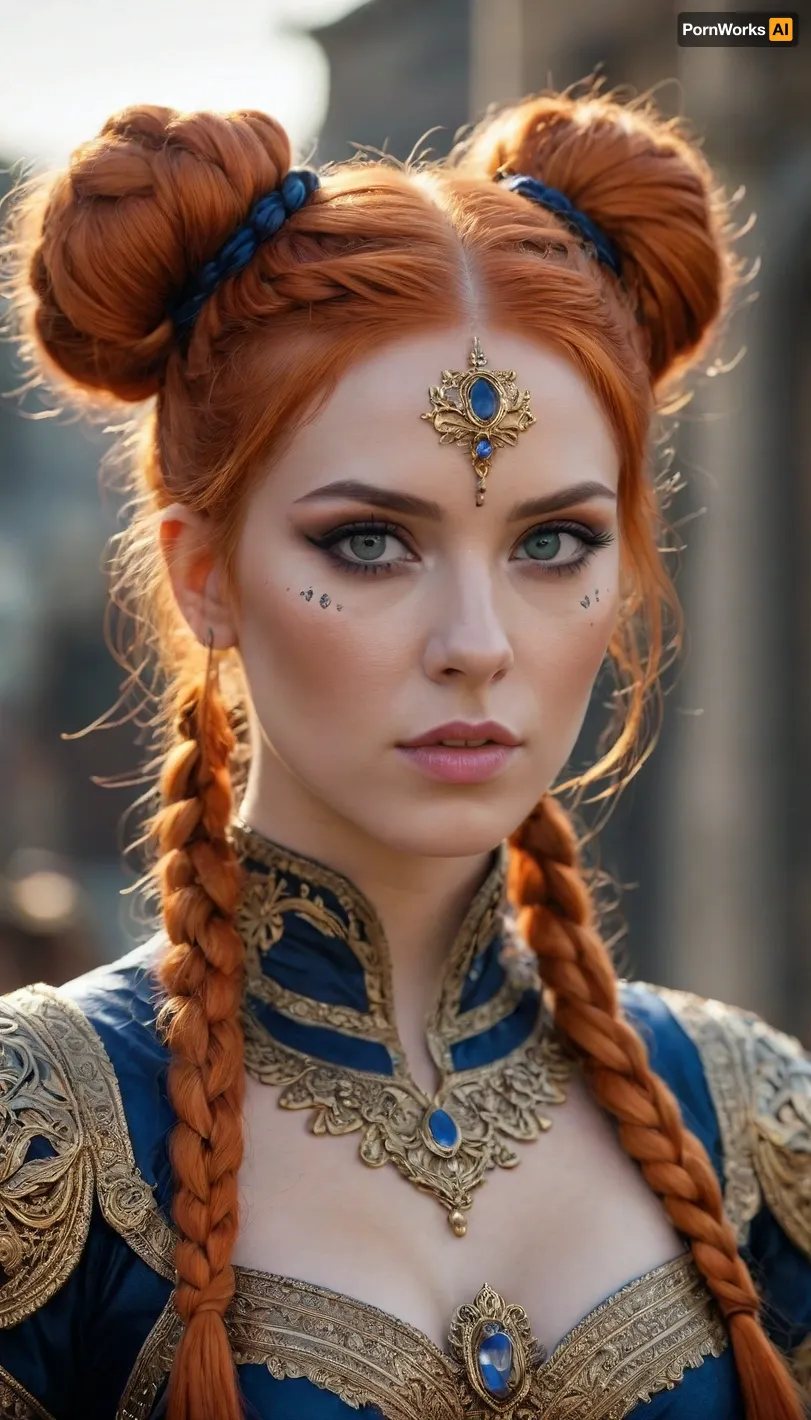 20000419.1, A mesmerizing fantasy portrait of a fierce warrior princess with striking, fiery orange hair styled into intricate twin buns and detailed braids. Her deep blue eyes contrast against the warm hues of her ornate golden and black embroidered outfit, creating a regal, almost mythical presence. The detailed face paint adds an extra layer of mystique and power to the image 20000419.1, A mesmerizing fantasy portrait of a fierce warrior princess with striking, fiery orange hair styled into intricate twin buns and detailed braids. Her deep blue eyes contrast against the warm hues of her ornate golden and black embroidered outfit, creating a regal, almost mythical presence. The detailed face paint adds an extra layer of mystique and power to the image